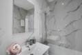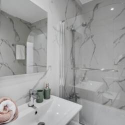 The apartment features an open-plan living and dining area, a fully equipped kitchen, and two spacious bedrooms. The master bedroom includes an en-suite bathroom, while the second bathroom is easily accessible from the rest of the apartment.